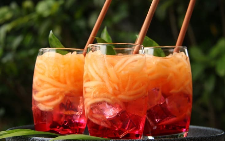 - Campur blewah yang telah diserut dengan dan biji selasih, gula cair, es batu, dan air putih secukupnya.
