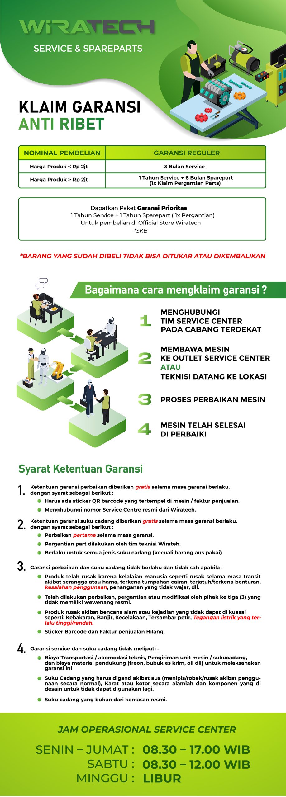 Demi kenyamanan garansi produk Anda mohon diperhatikan syarat dan ketentuan yang telah ditetapkan oleh WIRATECH. Kami akan menjamin segala ketersedian spare part dan jasa service mesin yang Anda butuhkan selama masa garansi masih berlaku. Konsultasi di luar dari service center WIRATECH merupakan bukan tanggung jawab kami sepenuhnya.