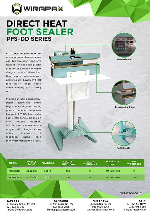 • PFS-300DD || PFS-400DD: menggunakan sistem direct heat sealer. Dengan memanaskan balok kuningan yang tidak mudah lengket karena terdapat kembangannya. Lebih mudah dibersihkan karena tidak menggunakan teflon sheet lagi. Direkomendasikan untuk plastik seperti alumunium foil & metallized.