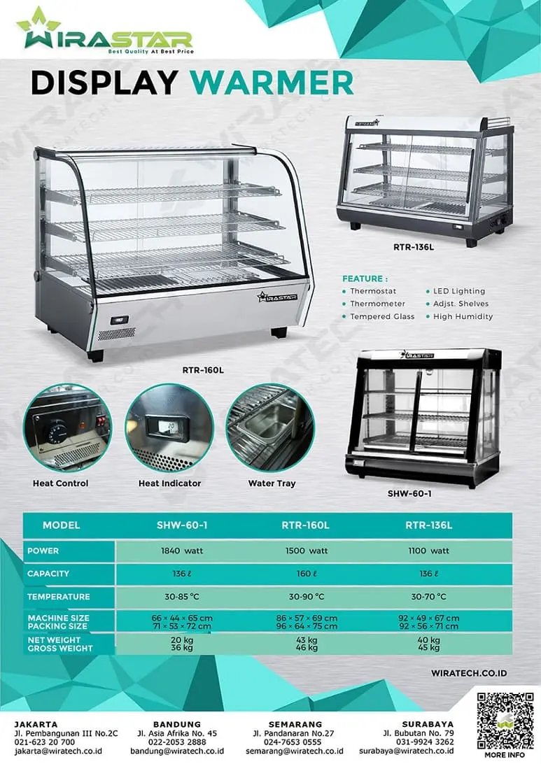 Cake/Pastry Showcase. Cake showcase terbagai menjadi dua, yaitu countertop showcase dan full cake showcase. Countertop showcase adalah lemari pendingin ini biasanya diletakkan di atas countertop (meja marmer) yang berdekatan dengan kasir sebagai akses pengambilan produk dengan leluasa. Sedangkan full cake showcase memiliki bentuk yang lebih besar daripada countertop showcase. Full cake showcase ini harus diletakkan di lantai langsung karena bentuknya besar dan berat. Ada pula showcase display warmer yang biasa di gunakan untuk mendisplay kue-kue kering atau makanan hangat hasil dari proses fryer