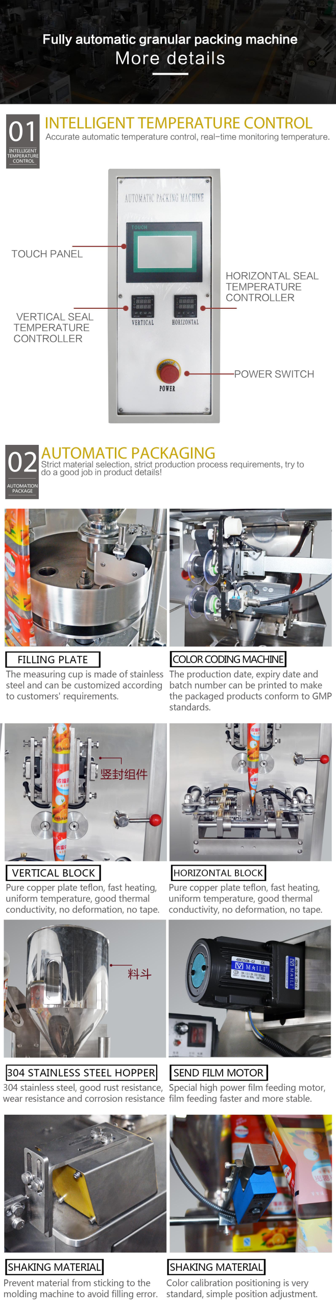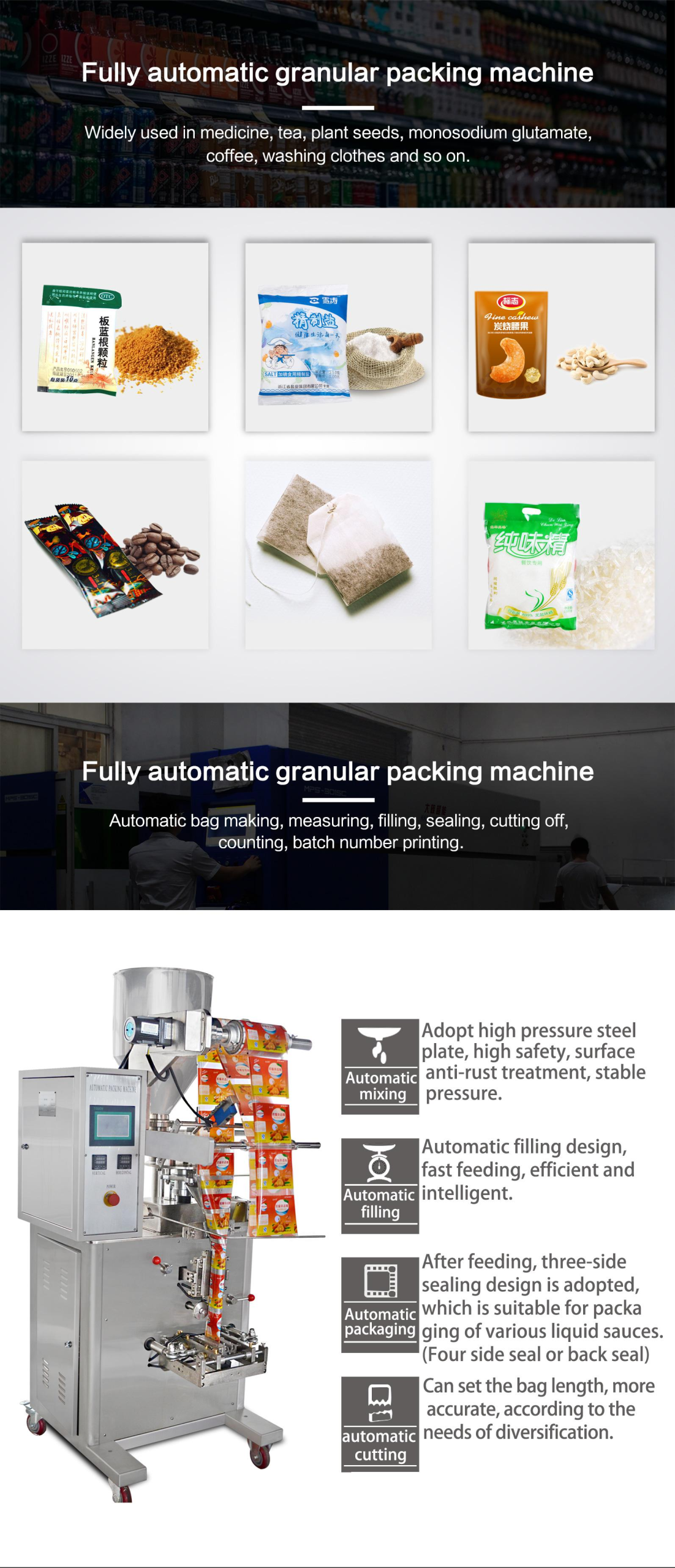 Automatic Granule Packing HXL K100 adalah sebuah mesin kemas Serbuk Kasar otomatis yang dirancang untuk mengisi dan menutup kemasan serbuk melalui satu mekanisme, tanpa perlu campur tangan manusia secara manual dalam pada cara kerjanya. Mesin ini biasanya digunakan dalam industri pengolahan Serbuk atau bahan olahan untuk mengemas berbagai jenis produk Serbuk Coklat,serbuk kopi,serbuk teh,Garam,Gula dll