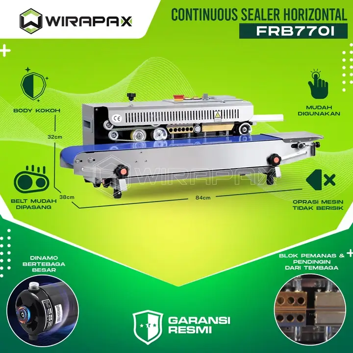 FRB 770i Sealer Horizontal merupakan salah satu jenis mesin continuous sealer termurah di Wiratech. Mesin ini memang sengaja di buat untuk memenuhi para pebisnis pemula yang mempunyai buget terbatas namun menginginkan mesin kemasan sealer yang berkualitas.FRB 770i hadir dengan balutan material full Stainless Steel berfinishing Polish, dari sisi material mesin ini di buat menggunakan material metal anti karat Sehingga konstruksinya cukup kuat dan solid dan mampu bekerja mengemas ukuran besar sekalipun