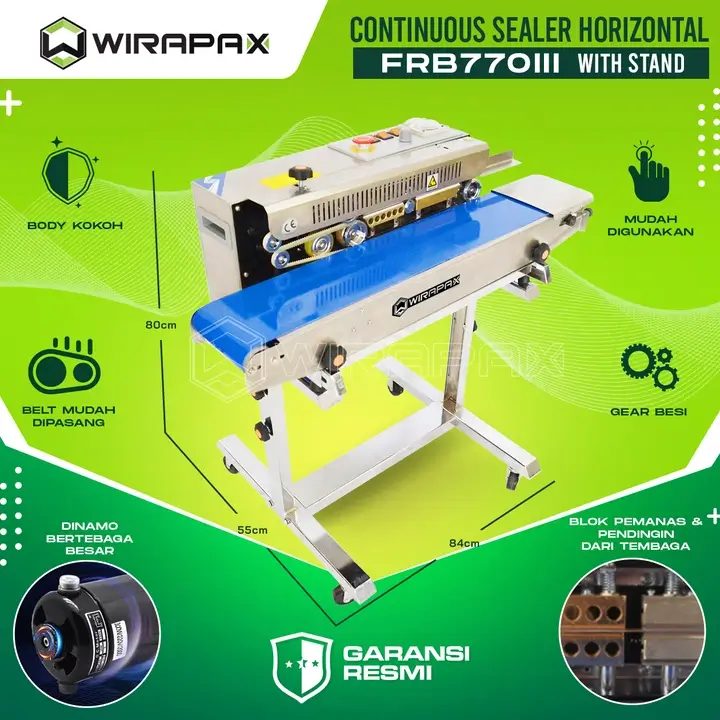 FRB 770iii Sealer Horizontal merupakan salah satu jenis mesin continuous sealer termurah di Wiratech. Mesin ini memang sengaja di buat untuk memenuhi para pebisnis pemula yang mempunyai buget terbatas namun menginginkan mesin kemasan sealer yang berkualitas.FRB 770i hadir dengan balutan material full Stainless Steel berfinishing Polish, dari sisi material mesin ini di buat menggunakan material metal anti karat Sehingga konstruksinya cukup kuat dan solid dan mampu bekerja mengemas ukuran besar sekalipun.