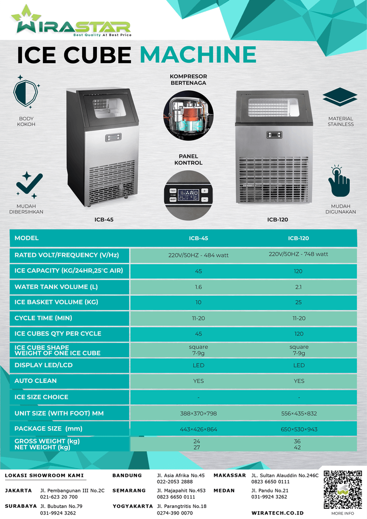 Mesin Es Batu ICB 120 adalah mesin yang mampu mencetak es batu kristal berbentuk kotak dengan kapasitas 90pcs setiap kali cetak, dengan waktu cetal 10-20menit dan kapasitas yang di hasilkan setara kurang lebih di 120kg/hari. Bin nya mampu menyimpang hingga 40kg/4000pcs dengan sumber inlet menggunakan mekanisme Automatic Water Intake.