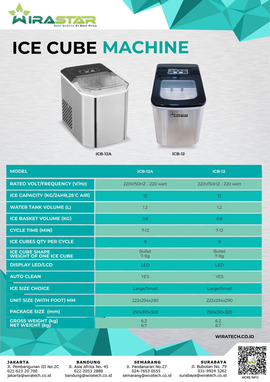 Mesin Cetak es batu ICB 12A mempunyai kapasitas produksi hingga 12kg/hari, sangat cocok di gunakan untuk kebutuhan rumah dan UKM skala kecil. Mesin ini di tenagai dengan daya listrik 110watt di 220Volt sehingga mampu mencetak dengan konsisten 9 butir es batu utk tiap 7-12 menit sekali.