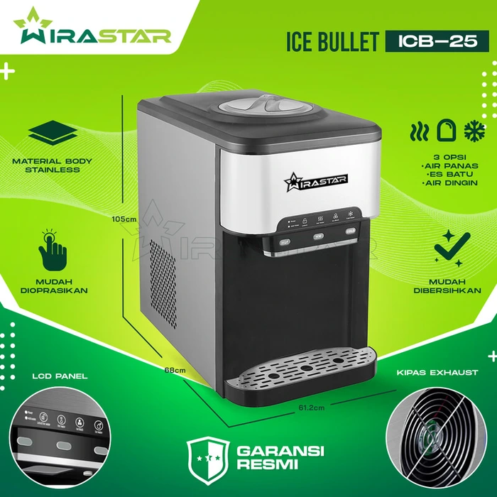 Mesin cetak es batu kristal ICB 25, merupakan salah satu mesin canggih yang mempuyai fungsi 3 in 1 yang sangat kompak. Mesin ini mampu menjadi dispenser air dingin dan panas sekaligus bisa mencetak butiran es batu tipe tube sesuai dengan yang kita butuhkan.