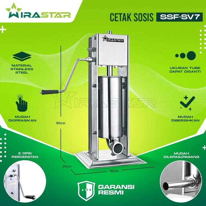 Tipe mesin cetak sosis yang satu ini memiliki kapasitas 7 liter daging pada kapasitas tank atau tabung. Tabung tersebut berfungsi untuk menampung banyaknya daging yang akan dicetak menjadi bentuk sosis. Mesin ini dioperasikan secara manual dengan harga yang relatif terjangkau. Sangat cocok untuk Anda yang baru merintis usaha.