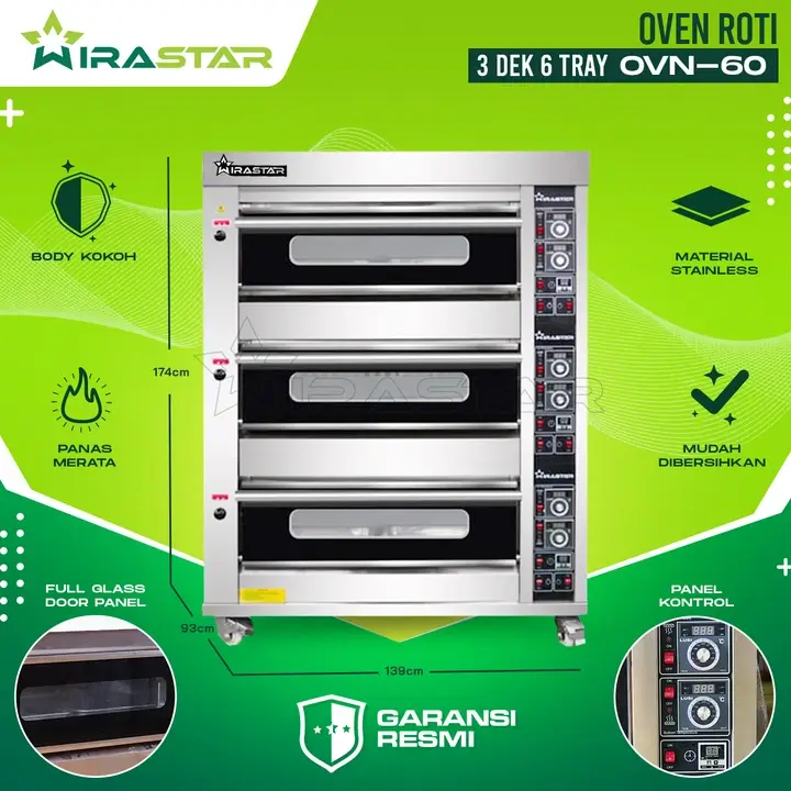 Oven Roti 3 Deck 6 Trays adalah perangkat khusus yang dirancang untuk membantu Anda dalam proses pemanggangan roti dan kue. Dengan desain 2 lapisan (deck) dan mampu menampung 4 nampan sekaligus. Oven ini ideal untuk dapur industri, restoran, kafe, dan usaha roti skala menengah hingga besar. Oven yang kami tawarkan sangat terjangkau dengan garansi 1 Tahun. Hubungi kami sekarang.
