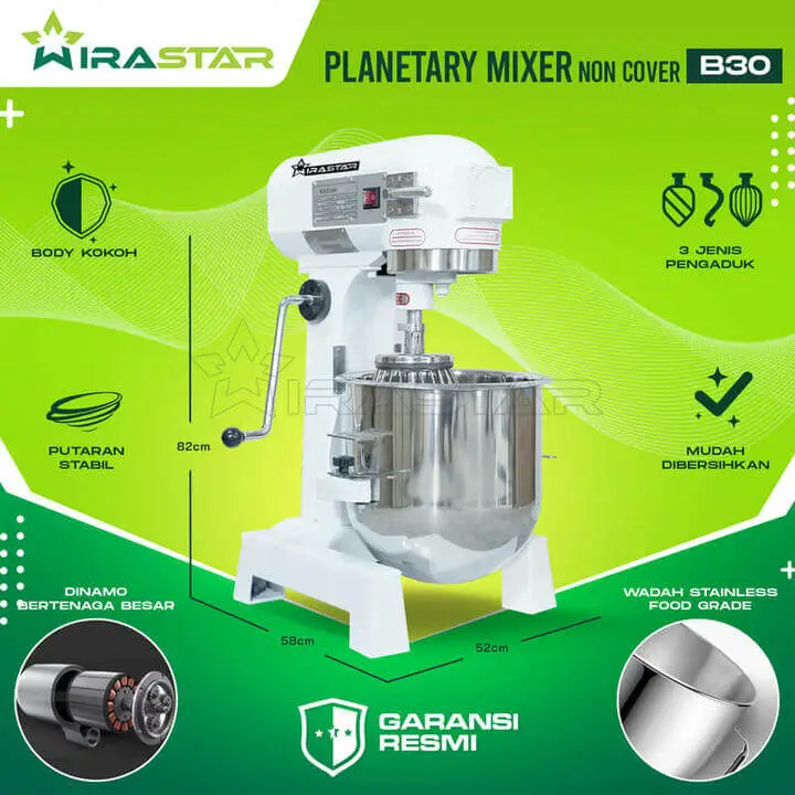 Planetary Mixer 30L – B30 Non Cover merupakan salah satu jenis mixer roti yang paling banyak di cari. Mixer ini mempunyai kemampuan yang sangat baik dalam proses pengolahan adonan roti dan kue.