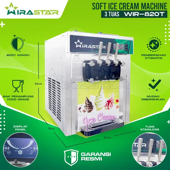 Dapatkan mesin pembuat es krim import termurah dan bergaransi resmi di WIRATECH. Mesin ice Cream Maker WIR820F – 3 Valve 20-25L/h Floor Type Floor Type merupakan salah satu tipe mesin es krim 3 Pompa tipe stand yang paling laris saat ini. Mesin ini mempunyai power output sebesar 1800 Watt dengan temperatur maksimum mencapai -25 derajat celcius.