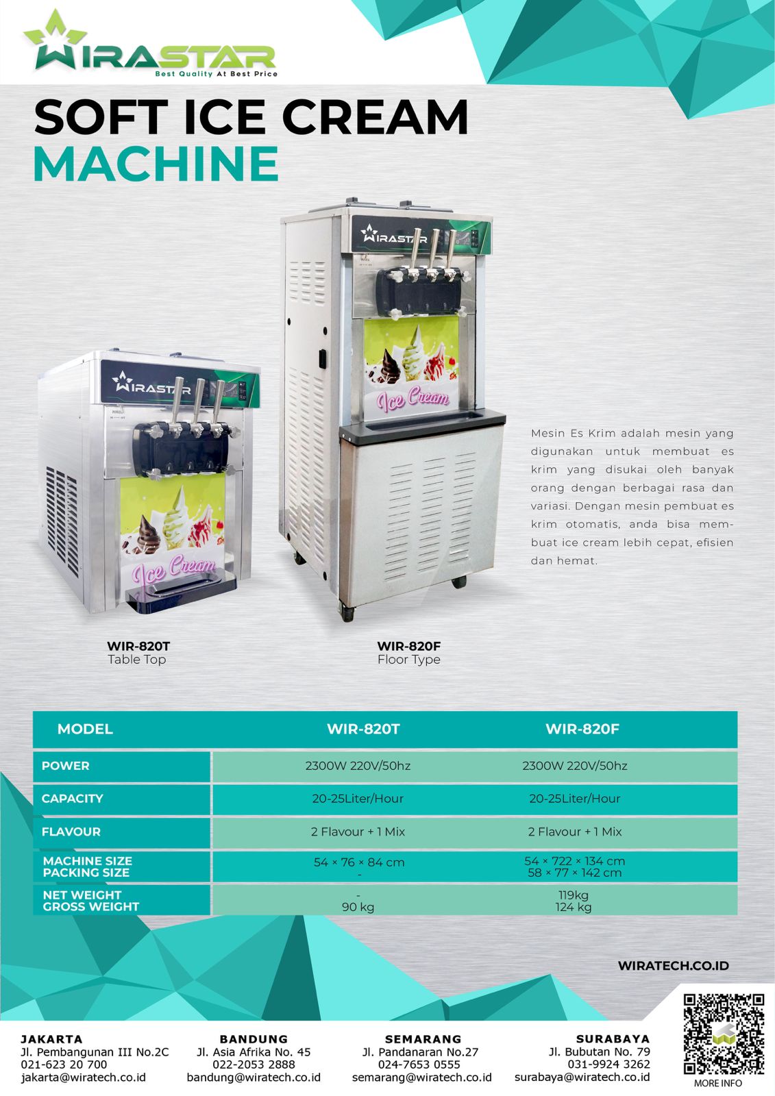 Seri Wir 820 sendiri merupakan salah satu seri best seller dari Wiratech. Mesin ini laku terjual ratusan unit dalam sebulan, bukan karena harganya saja yang terjangkau, tetappi spesifikasi yang di usung juga semakin modern dan canggih. Beragam fitur dan teknologi terbaru ikut di benamkan seperti Puffing System, Digital panel Instrument,Counter Indicator, Voltage Indicator dan Fitur Self Cleaning yang sangat penting.