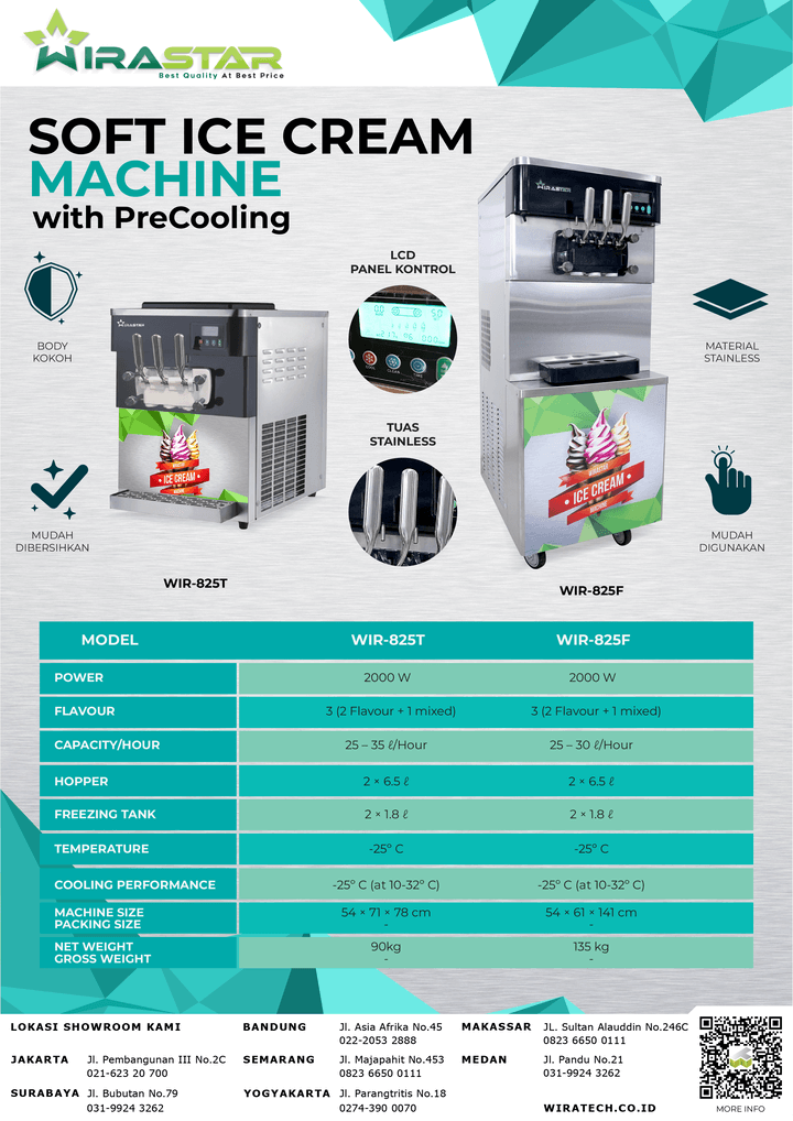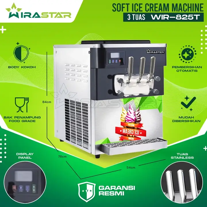 WIR825T – 3 Valve 25-35L/h Table Type adalah mesin es krim yang digunakan untuk membuat es krim yang disukai oleh banyak orang dengan berbagai rasa dan variasi. Dengan mesin pembuat es krim otomatis, anda bisa membuat ice cream lebih cepat, efisien dan hemat. Dapatkan mesin pembuat es krim import termurah dan bergaransi resmi di WIRATECH.